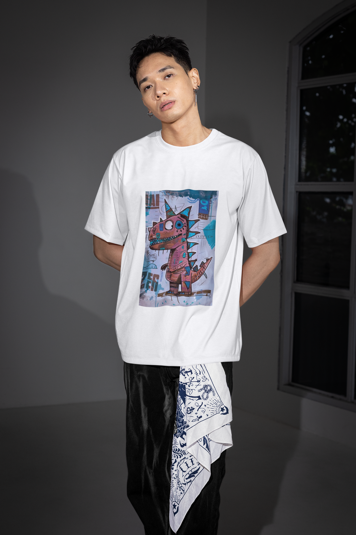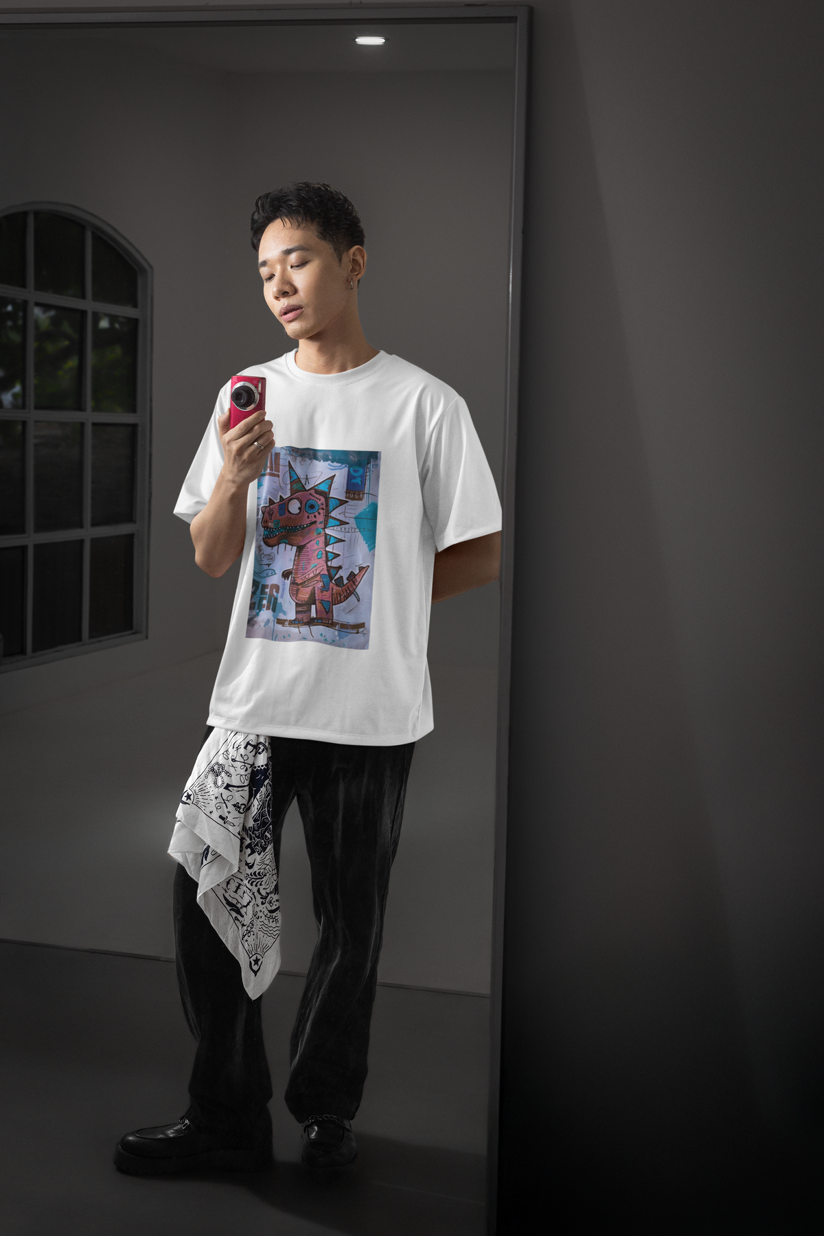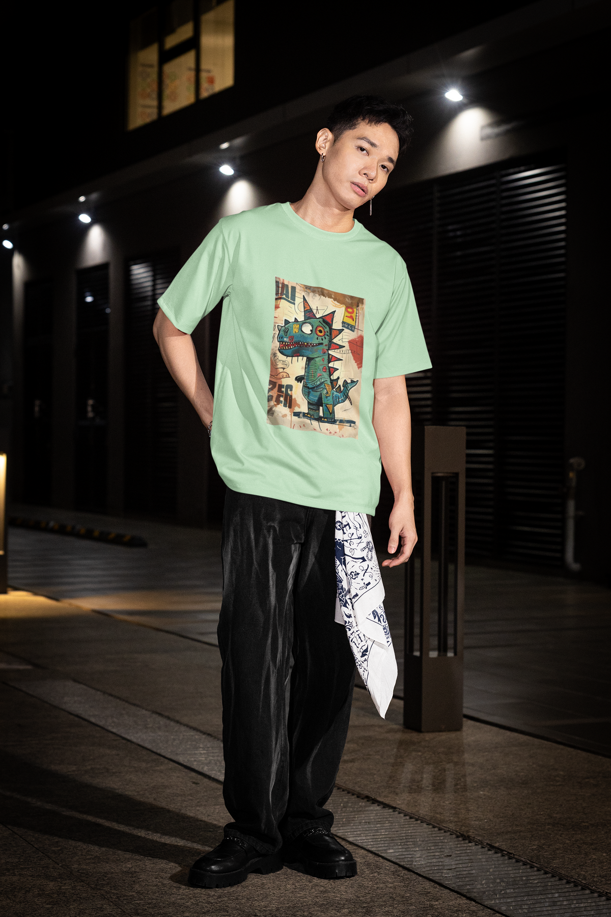 "DinoVibe" tee design embodies a combination of playful dinosaur imagery fused with a contemporary, dynamic energy that makes it a fun and memorable fashion statement."