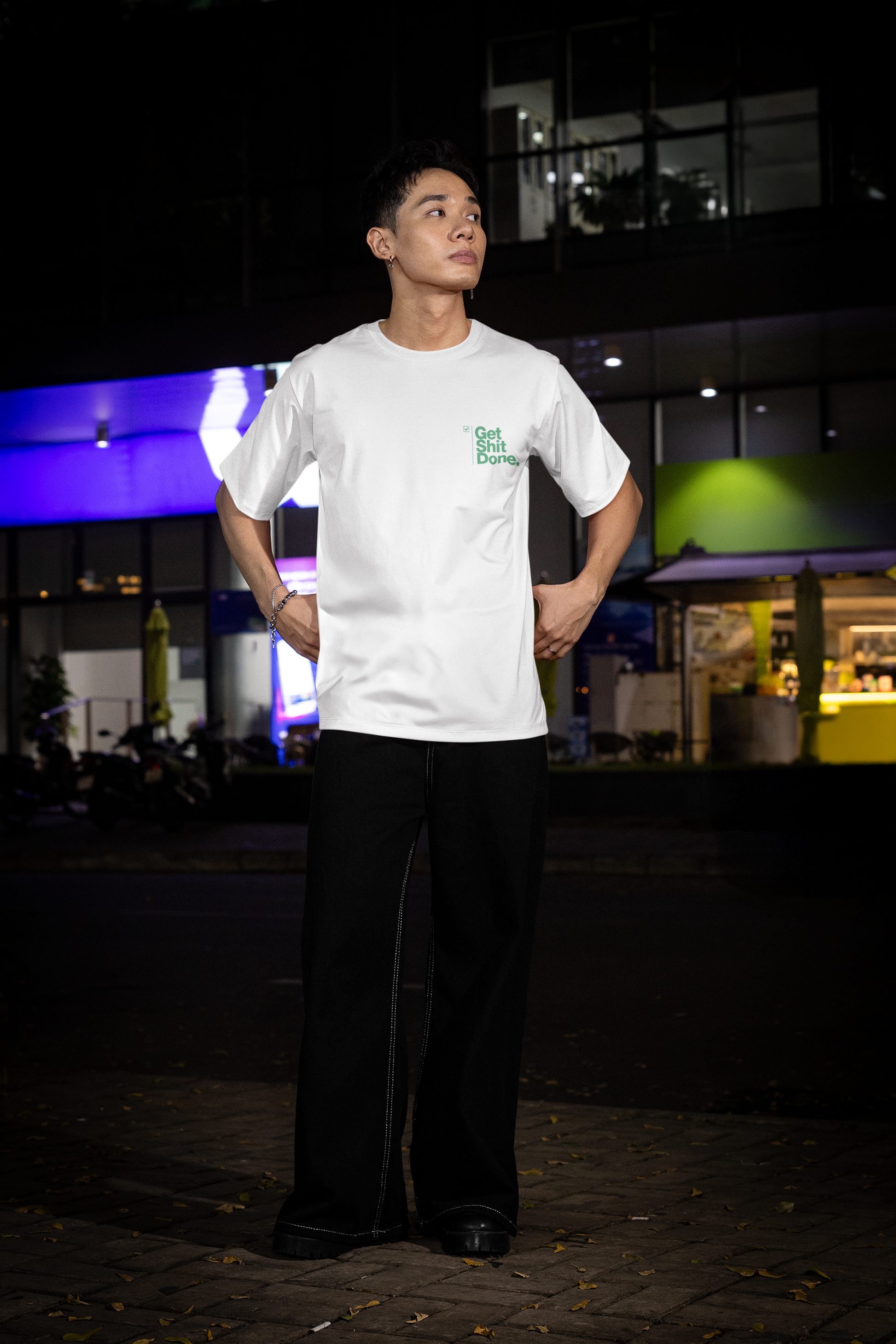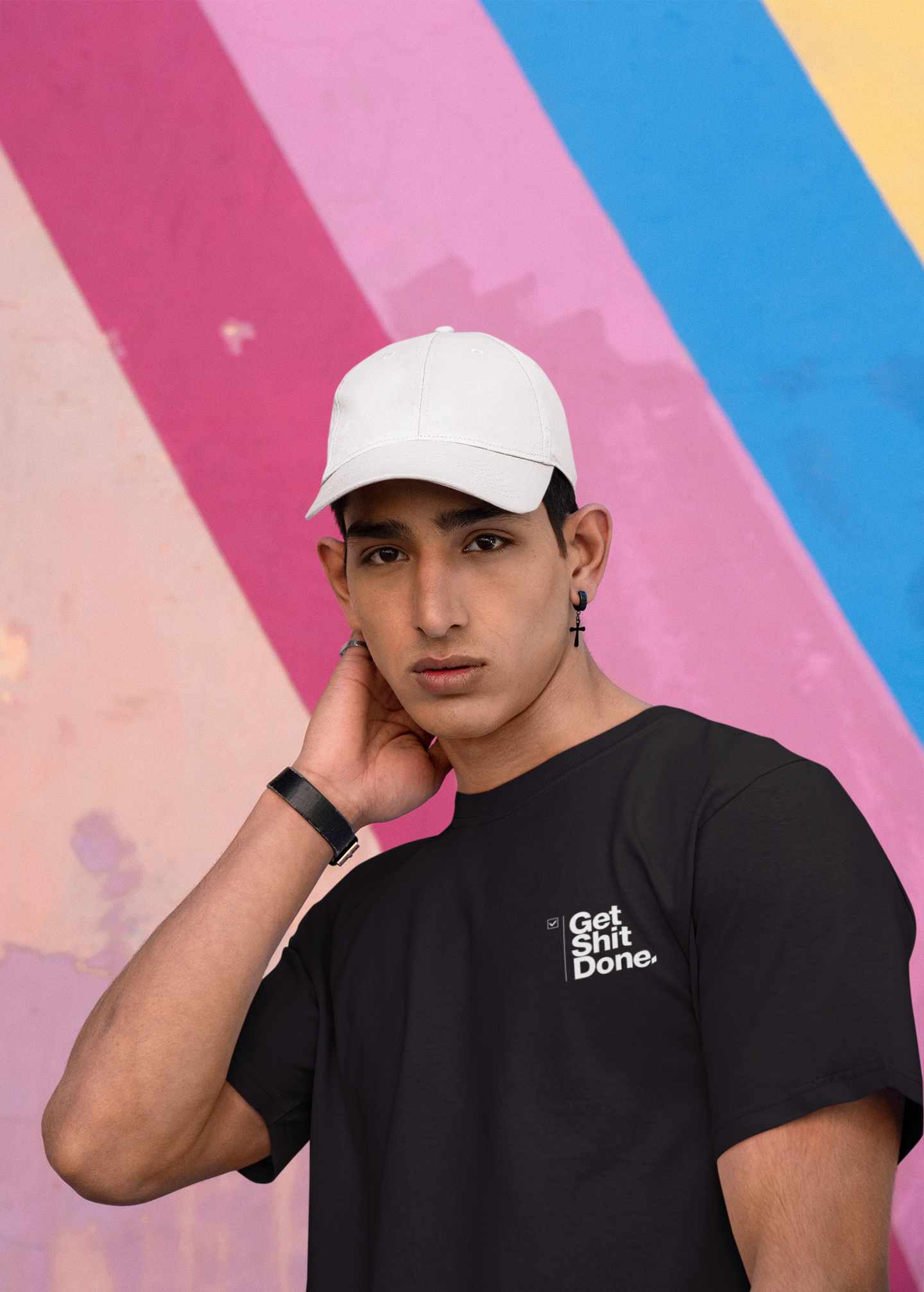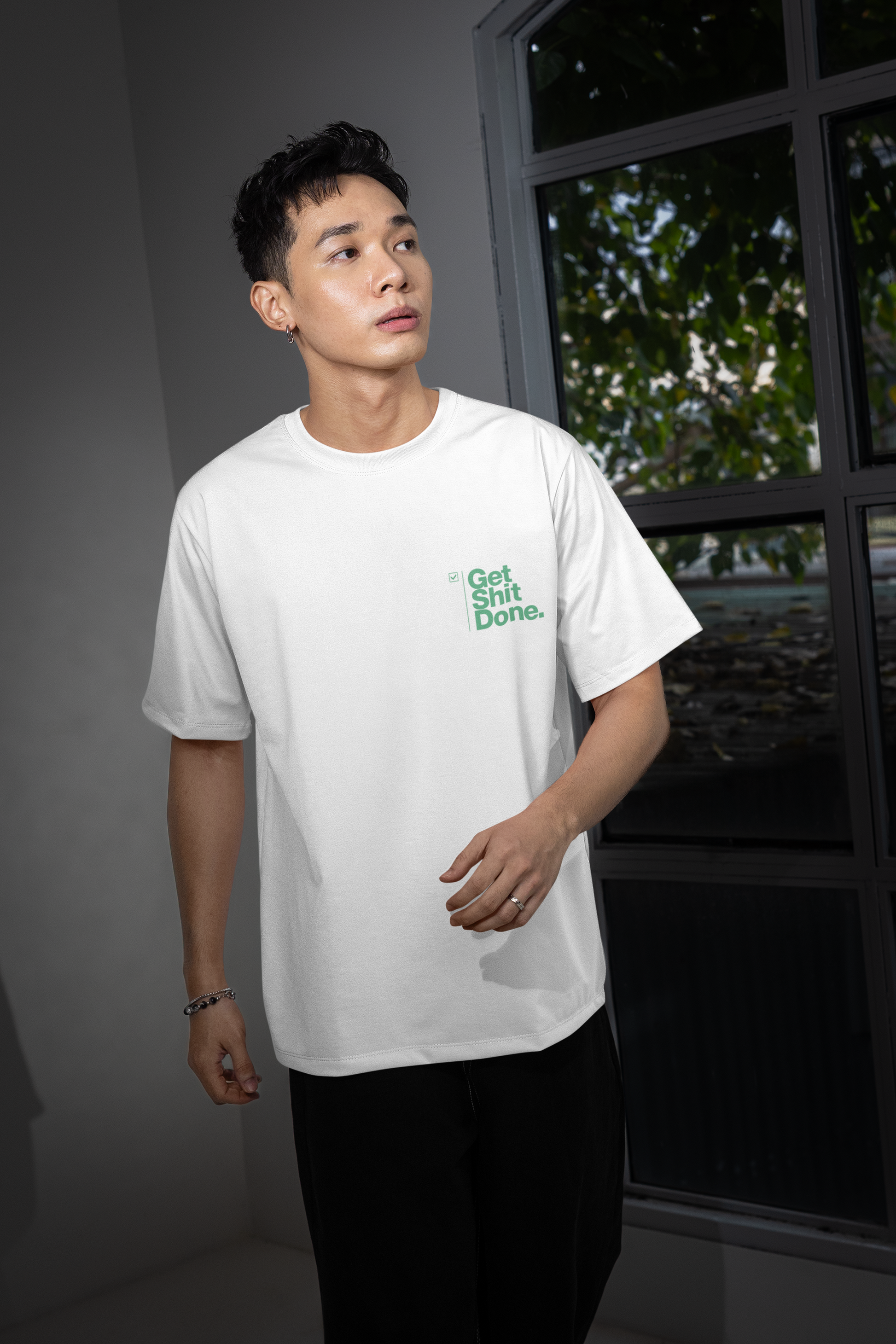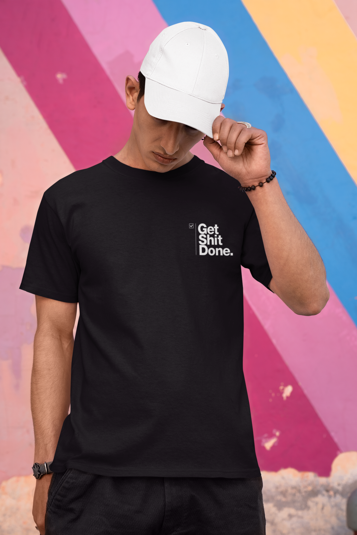 Made from premium-grade cotton, it offers a luxuriously soft feel with breathable comfort that lasts all day. The high-quality, fabric-safe print captures the " features strong, modern typography for the "Corporate Hustle" name prominently, paired with the cheeky "Get Shit Done" slogan in a smaller yet impactful font beneath.